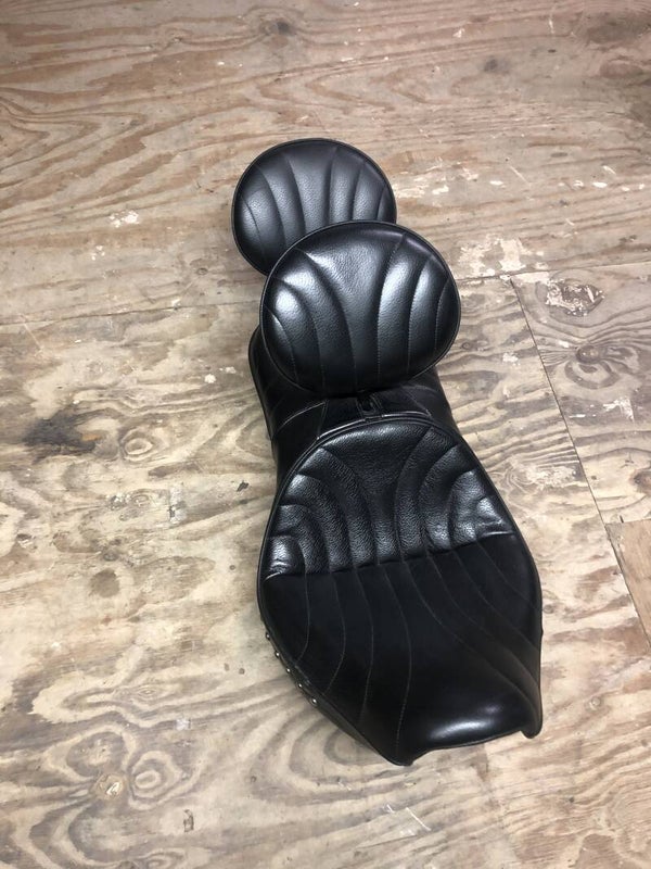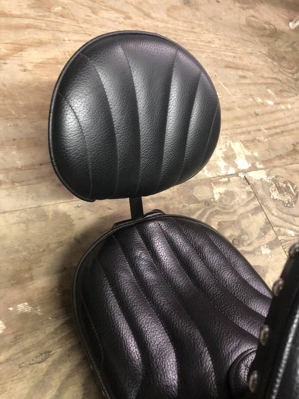 voorzien van 2 rugsteunen welke afneembaar ijn, zitten geen beschadigingen op het zadel ,kleur zwart.
